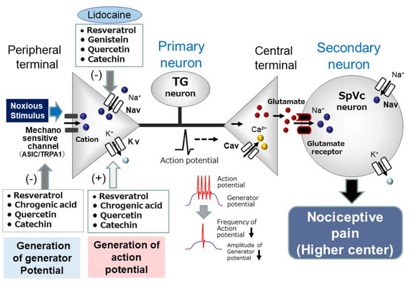 Previously, using in vitro studies, we showed that phytochemicals are involved in the activity of voltage-gated/ligand-gated ion channels and the function of neurotransmitters/receptors involved in the expression of neuronal electrical signals, including pain-transmitting neurons in the CNS and peripheral nervous system. Our neurophysiological approach in recent in vivo experiments has revealed that phytochemicals, such as resveratrol, chlorogenic acid, isoflavones, quercetin, catechin, lutein, and theanine, act on several molecular targets producing local anesthetic effects, intravenous anesthesia/analgesic effects, and inflammatory pain-alleviating effects [40, 43-46, 58, 59, 61, 66, 68-71].