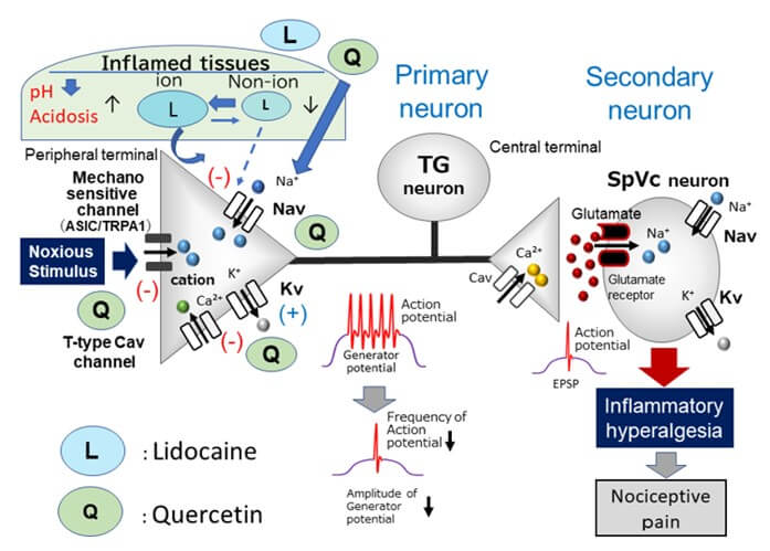 However, observation of the local anesthetic effects of dietary constituents acting on nociception has been based on changes in the excitability of nociceptive secondary neurons, and not primary afferent activity. Therefore, it still remains to be determined if local administration of such dietary constituents to rats attenuates the excitability of nociceptive primary neurons in response to mechanical stimulation in vivo. Previous studies reported in vitro conditions, quercetin inhibits Nav, Cav and activation of Kv channels in cardiac muscle [16, 19]. Recently, we found that in vivo local injection of quercetin into the peripheral receptive field suppressed the excitability of rat nociceptive primary sensory neurons in the TG, possibly via inhibition of Nav channels and opening of Kv channels in the nociceptive nerve terminals [46]. Therefore, in the absence of neuropathic and inflamed conditions, administration of the phytochemical, quercetin, as a local anesthetic may provide relief from trigeminal nociceptive pain with the smallest side effects, thus contributing to the use of CAM.