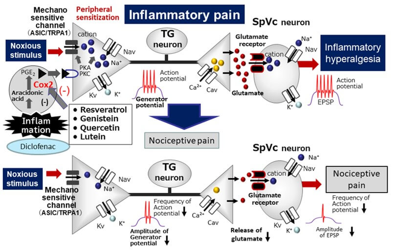 As with resveratrol, we also reported that systemic administration of the phytochemicals, isoflavone and quercetin, restored CFA-induced inflammatory hyperalgesia and hyperexcitability of SpVc WDR neurons to the level seen in naïve rats [69, 70]. In particular, the inhibitory effect of quercetin (50 mg/kg, i.p.) on inflammatory hyperalgesia was equivalent to that of diclofenac (50 mg/kg, i.p.), a representative NSAIDs [70]. Generally, NSAIDs not only inhibit Cox-2 expressed in inflammatory sites, but also Cox-1, which is physiologically expressed in the stomach and kidneys, and thus carries the risk of side effects, such as gastrointestinal and renal disorders. Therefore, our findings suggest that chronic administration of polyphenols inhibits SpVc WDR neuron hyperexcitability through inhibition of the peripheral and Cox-2 signaling cascade pathways in nociceptive neurons and the resulting inflammatory hyperalgesia. Polyphenols, such as resveratrol, isoflavones, and quercetin, can avoid side effects and be applied as alternative treatments to NSAIDs in the prevention of inflammatory hyperalgesia (Figure 5).
